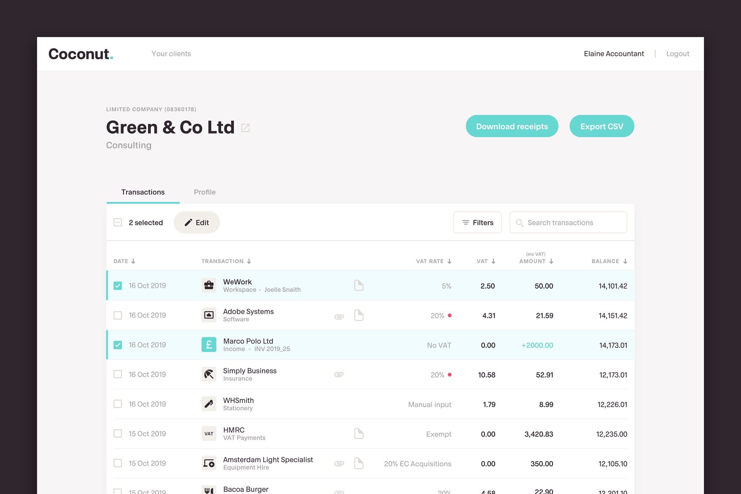 Accountants can review, correct and export client transaction data directly, eliminating traditional month-end reconciliation processes.