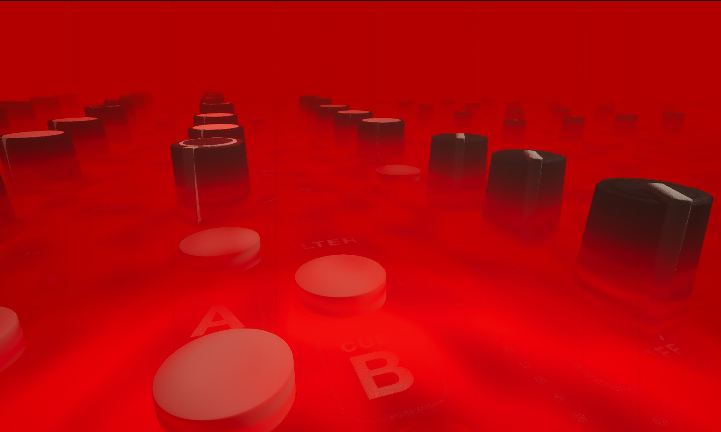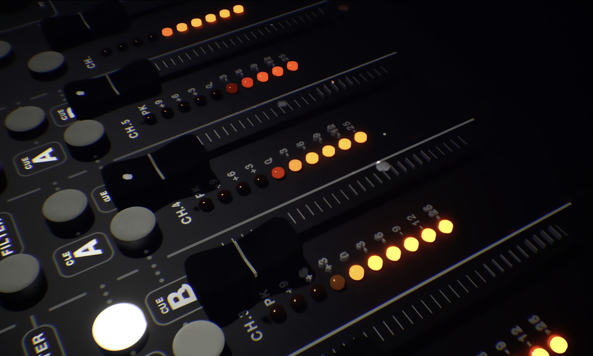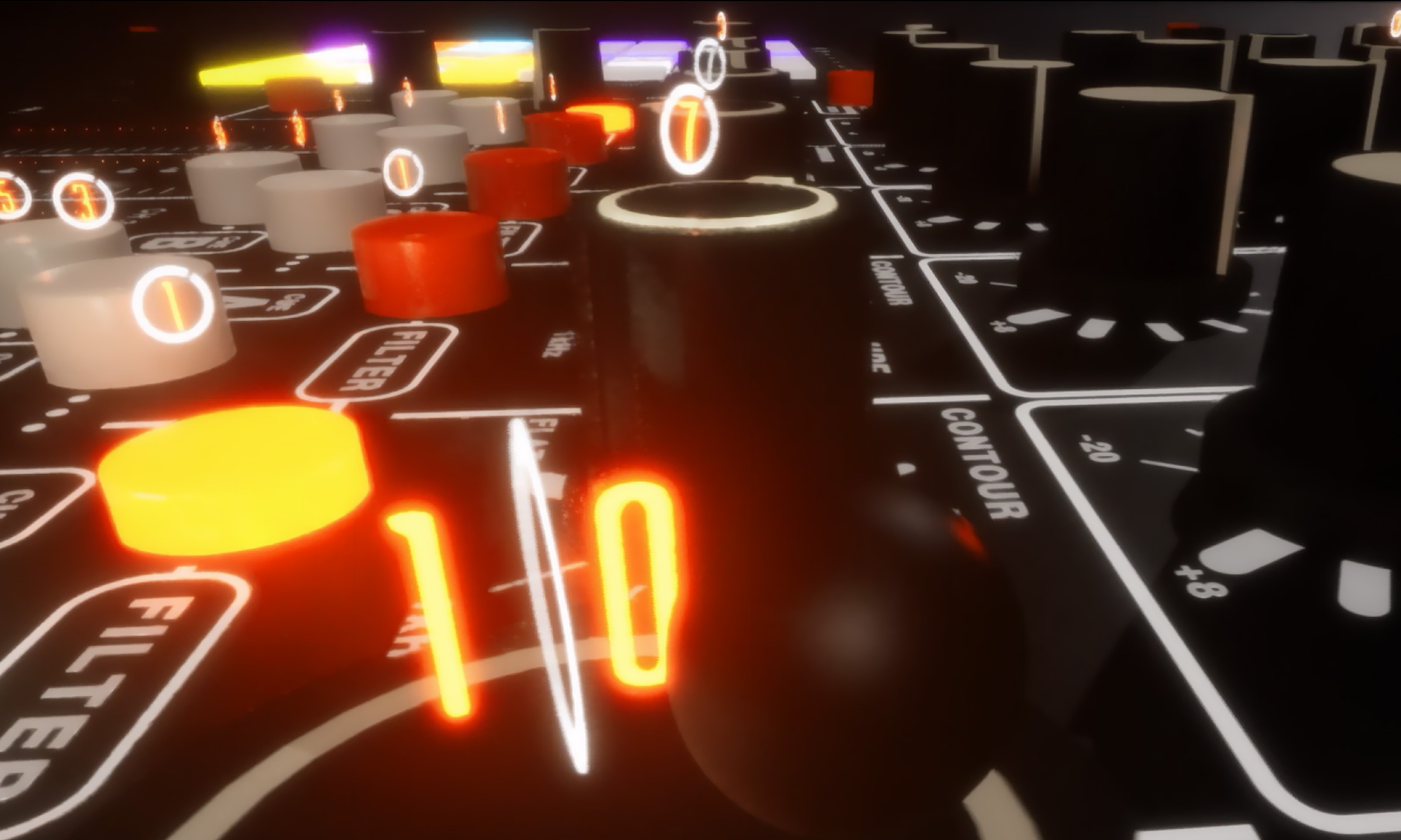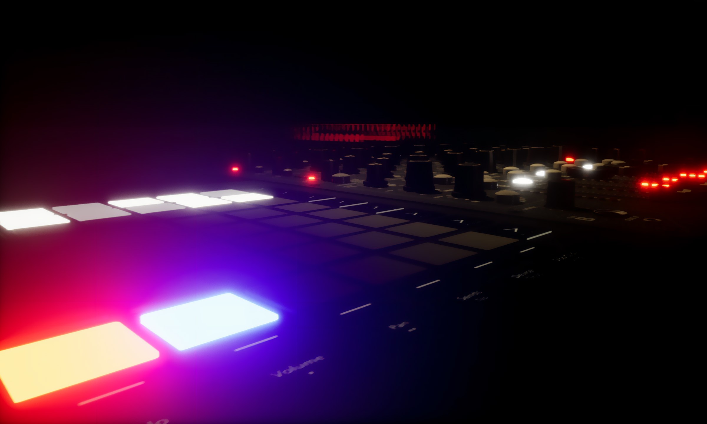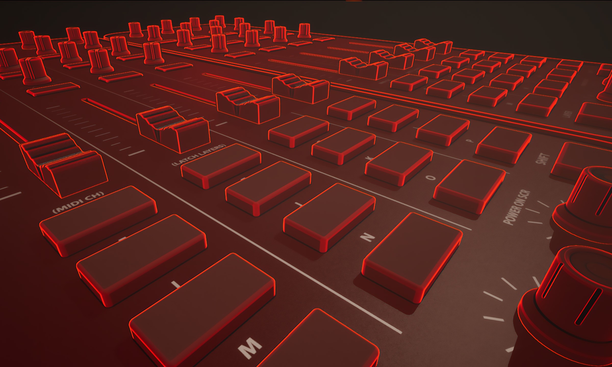 All of Richie Hawtin’s physical actions on the mixer and controllers during a live performance are reflected in the virtual world version in real time via MIDI data, which is sent into Unreal Engine and mapped to the sliders, knobs, and LEDs.