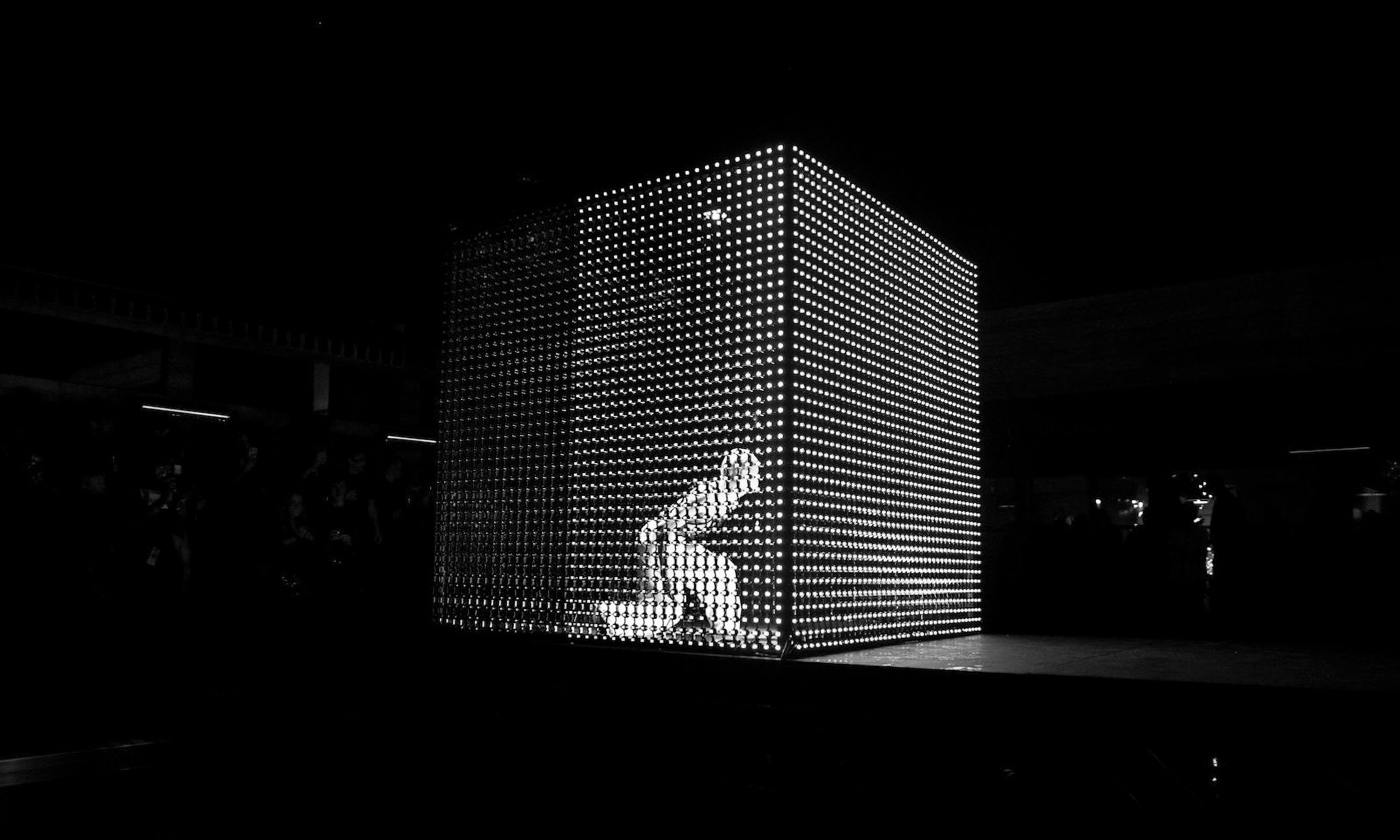 I was responsible for designing and operating the live monochromatic audio-reactive visuals displayed on all four sides of the cube, which hosted performances by Jazmin Bean and Jessica Winter, as well as contortionists and movement performers throughout the evening.