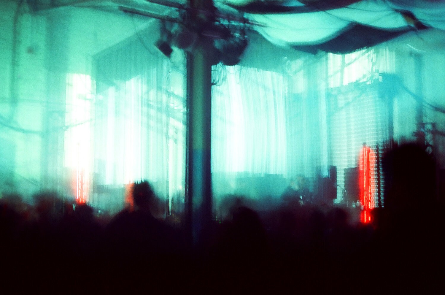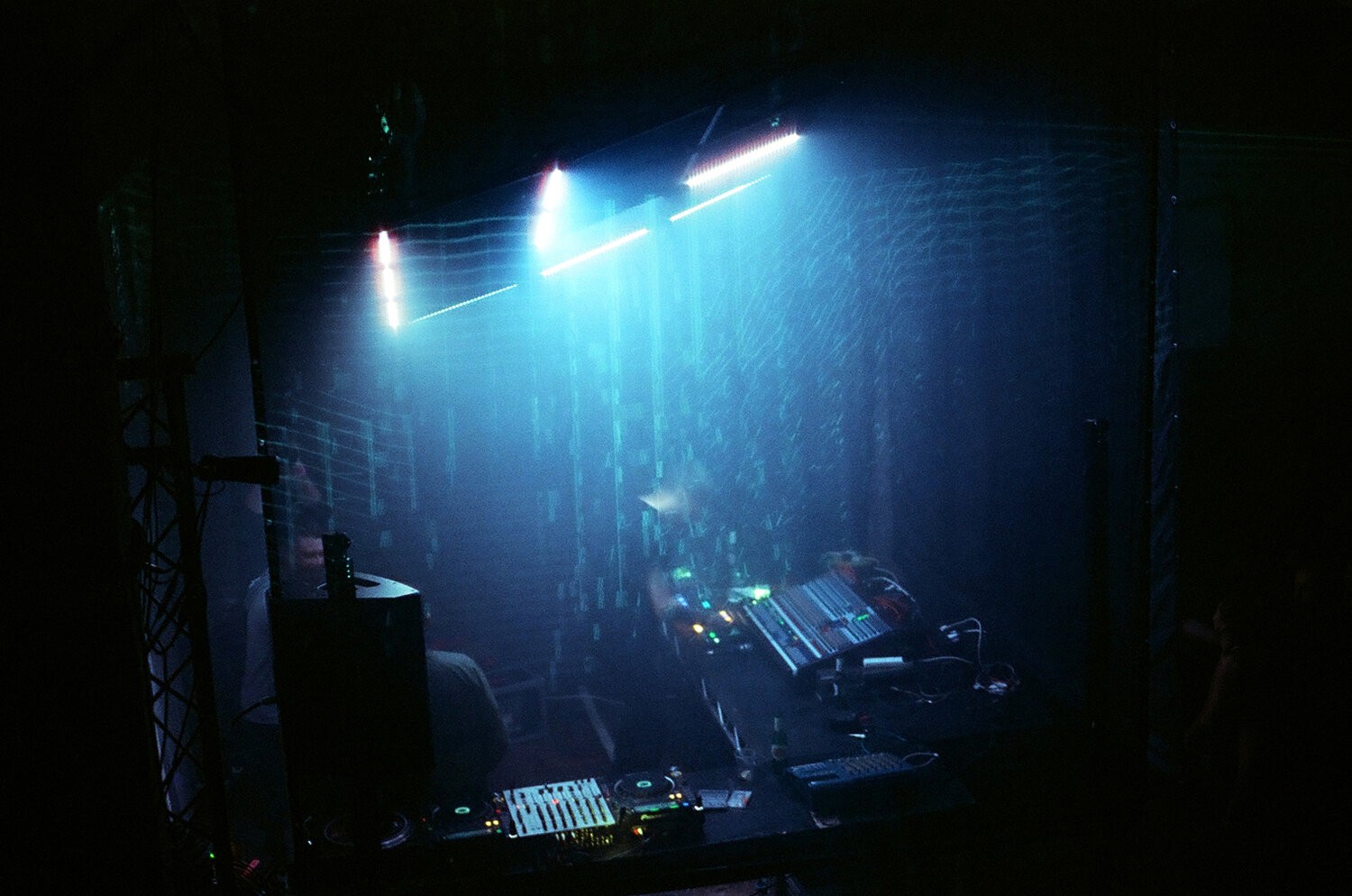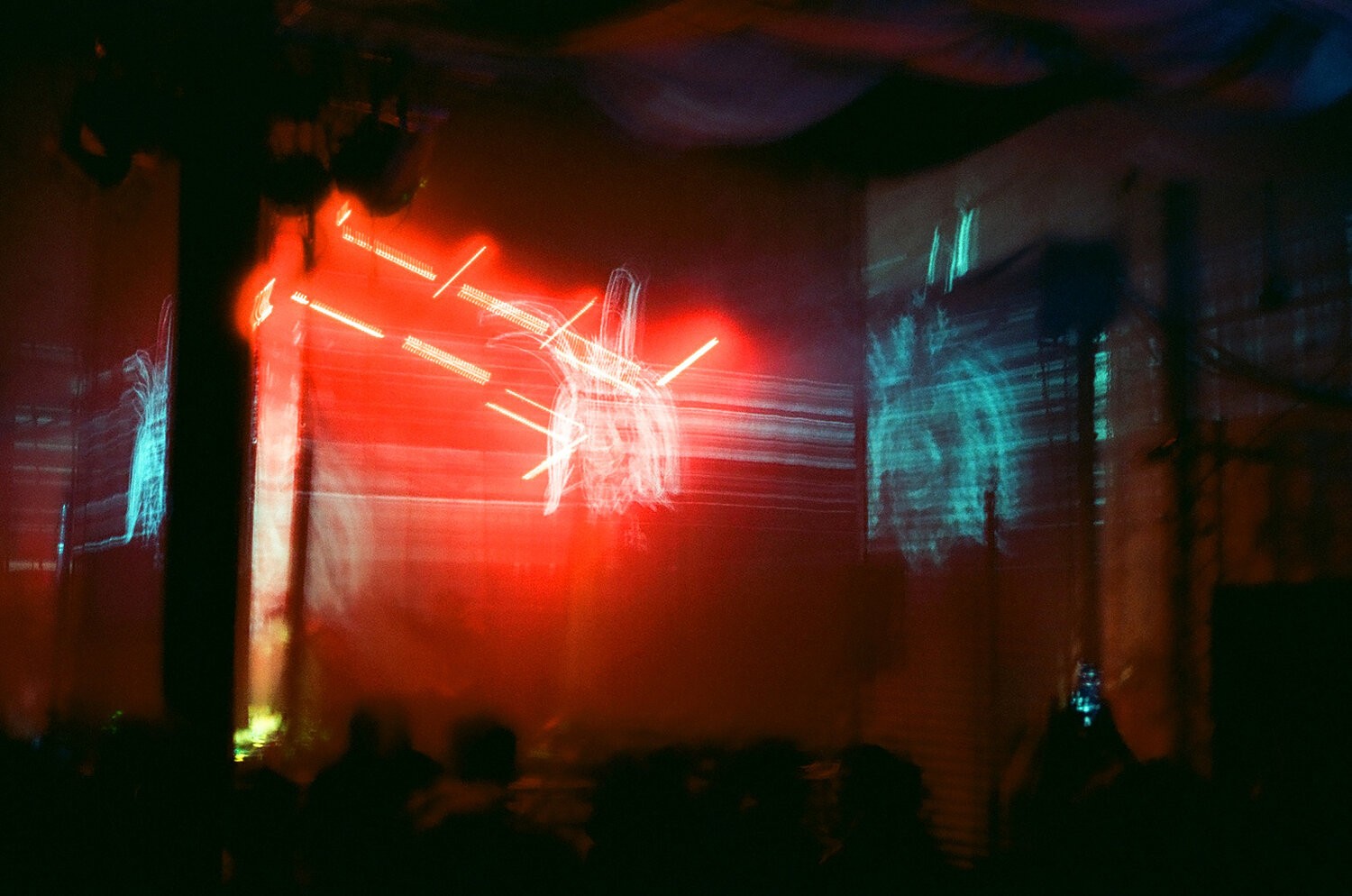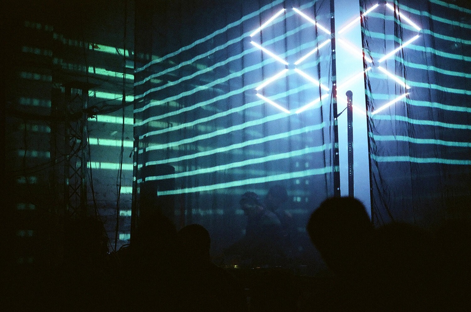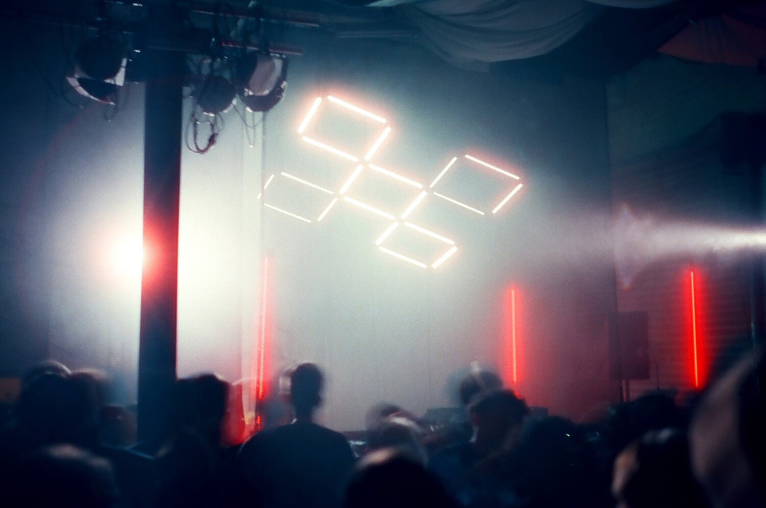 For Wyrd's UVB 76 showcase at Manchester's White Hotel, I collaborated with light artists SPEKTRA to create a site-specific installation. We projected visuals onto transparent scrim, creating a holographic effect that surrounded SPEKTRA's suspended diamond light sculpture.