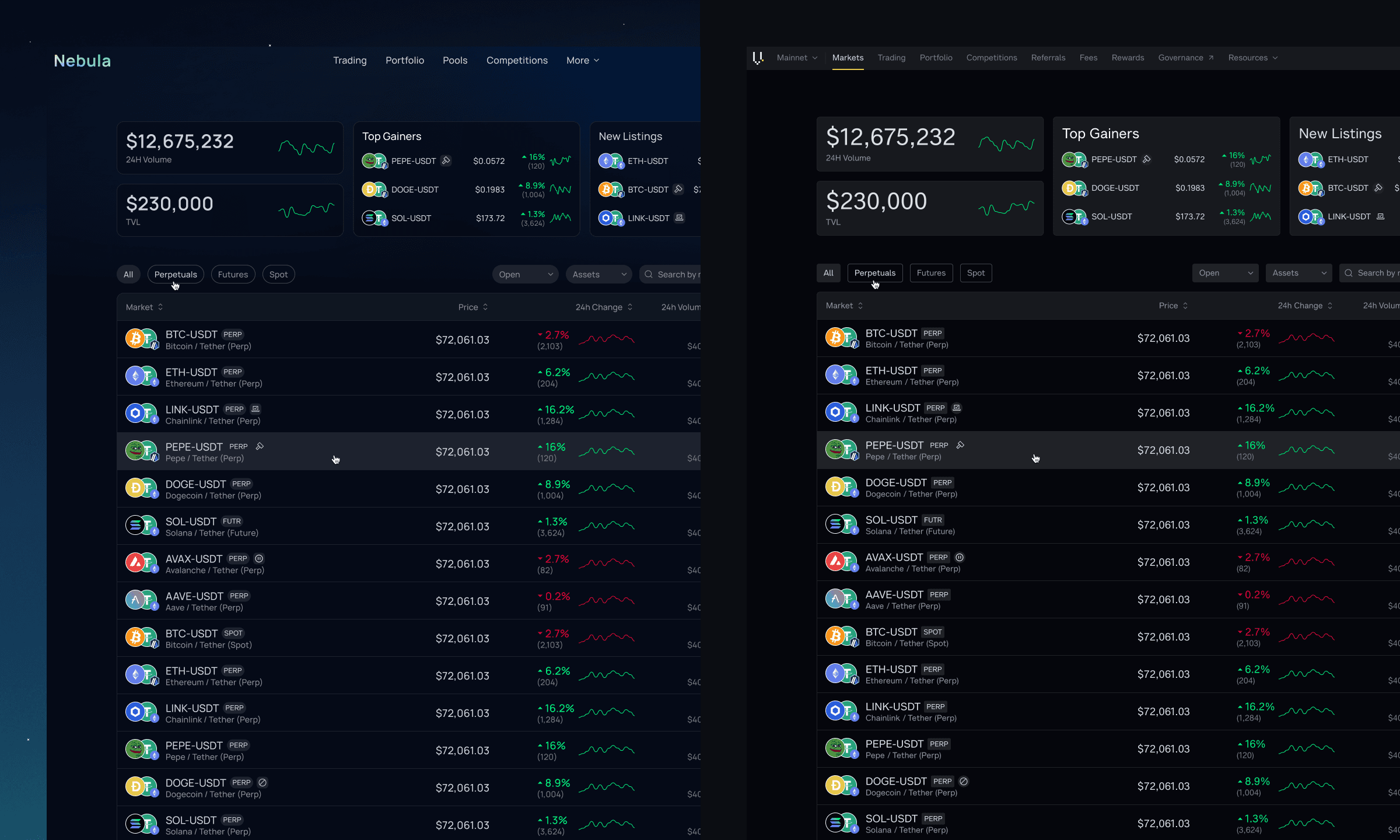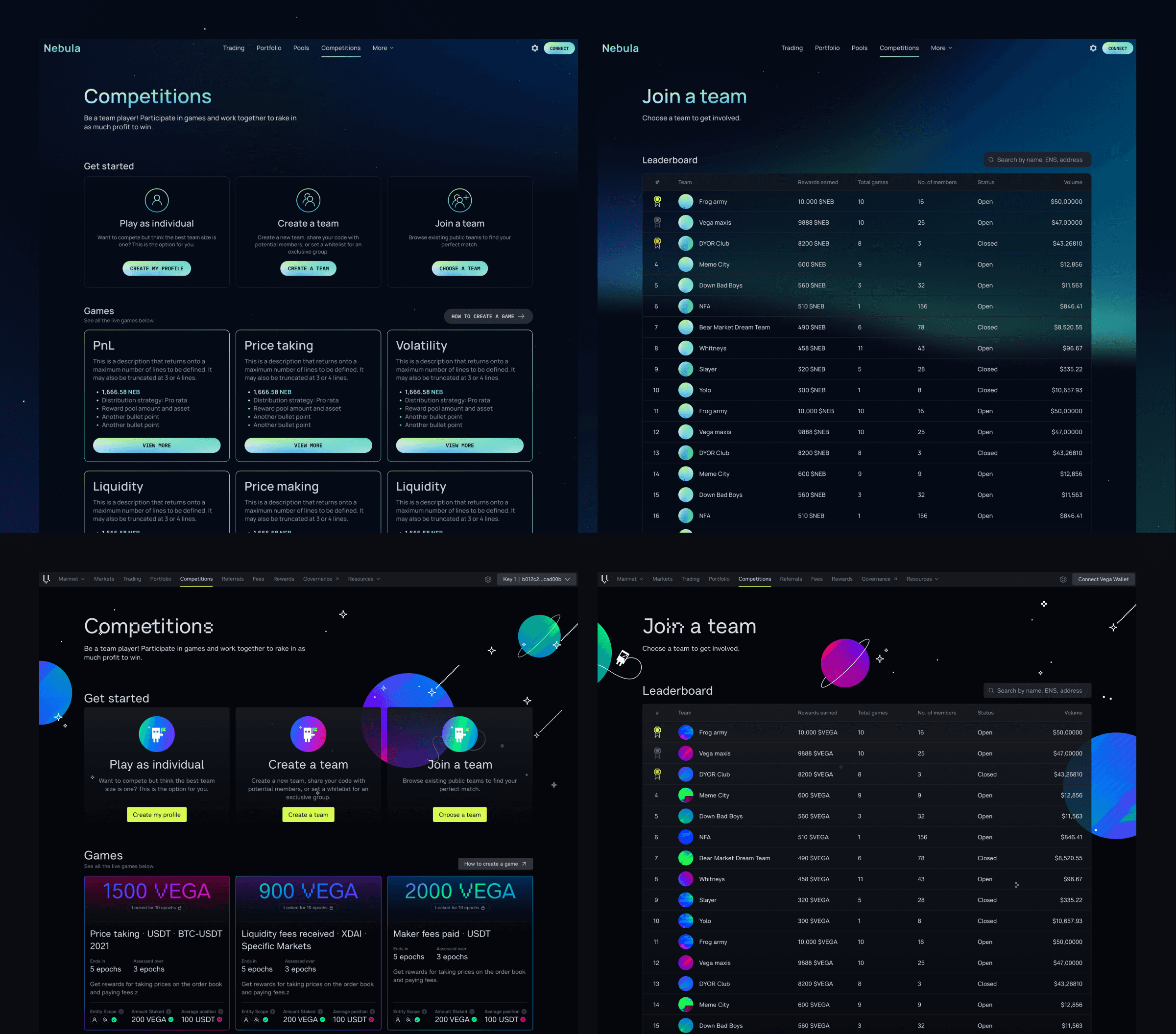 In parallel, I developed Nebula's visual design and designed new features that didn't exist in Vega Console such as the markets list and market creation flows.